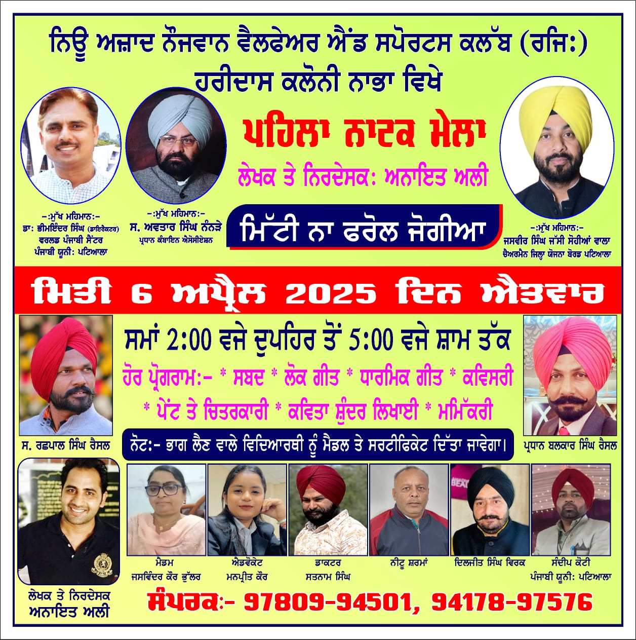 ਨਿਊ ਆਜਾਦ ਨੌਜਵਾਨ ਵੈਲਫੇਅਰ ਐਂਡ ਸਪੋਰਟਸ ਕਲੱਬ ਰਜਿ ਵੱਲੋਂ ਪਹਿਲਾਂ ਨਾਟਕ ਮੇਲਾ ਨਾਭਾ ਵਿਖੇ ਕਰਵਾਇਆ ਜਾ ਰਿਹਾ